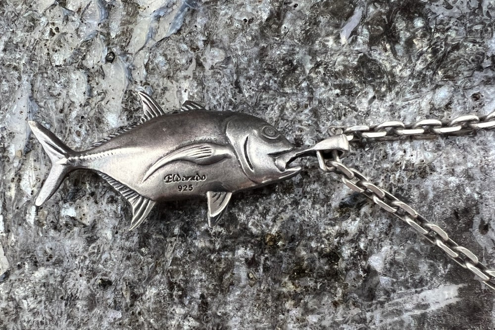 GT(ジャイアントトレバリー)のフォルムを忠実に再現。あえて黒ずんだ印象の”燻し加工”を施して陰影を整えることにより、ロウニンアジ独特の日焼けした背中を再現しました。右側面にはEldoradoと925を刻印しています。男女問わず着用いただけるサイズ感に仕上げました。