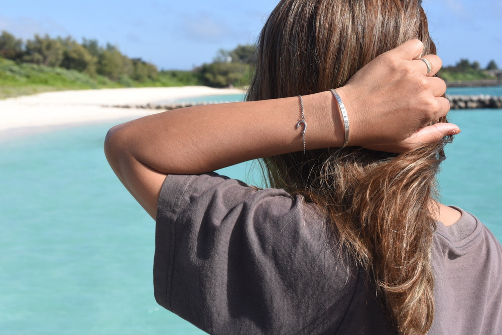 エルドラドから女性向けのシンプルな釣り針シルバーブレスレットが新登場!小ぶりな釣り針と細身のチェーンで主張しすぎずさりげなく釣り好きアピール♪ ブレスレット単体で身につけてもよし。お気に入りの腕時計と合わせてもよし。釣り場だけでなく普段着でも活躍してくれます。