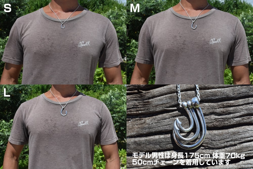 Sサイズ、Mサイズ、Lサイズを重ねて身に付けることでツインフックとして、その他のネックレスとの重ね付けなど表現の仕方は自由。No.1人気は「S×M」の重ね付けです。