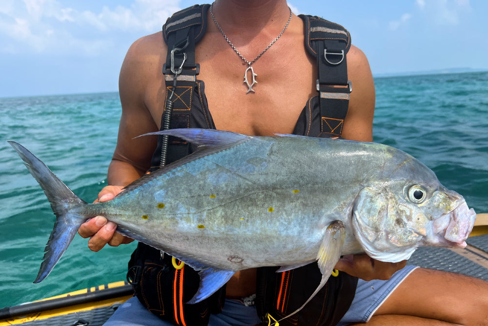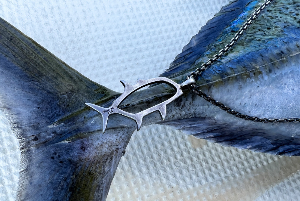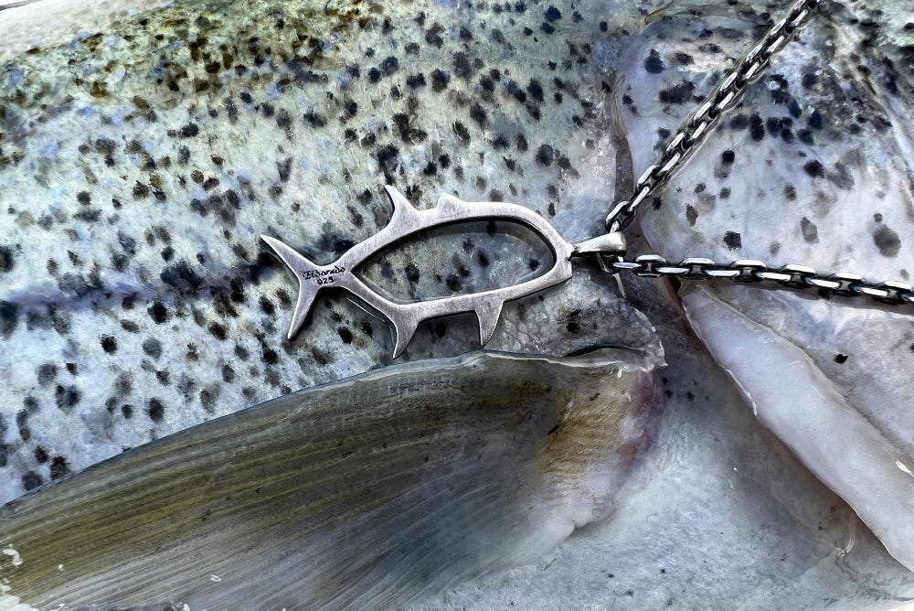 GT(ジャイアントトレバリー)のシルエットをモチーフにしたくり抜きプレートデザインのネックレストップ。片面の尾びれの付け根にEldoradoと925の刻印。男女問わず着用いただけるシンプルでかっこいいネックレスです。